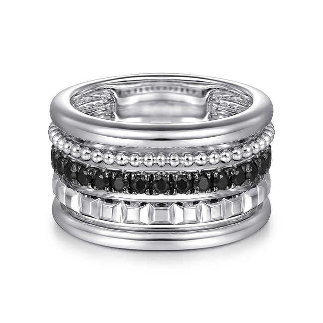 925 Sterling Silver Bujukan Black Spinel and Pyramid Multi Row Easy Stackable Ladies Ring