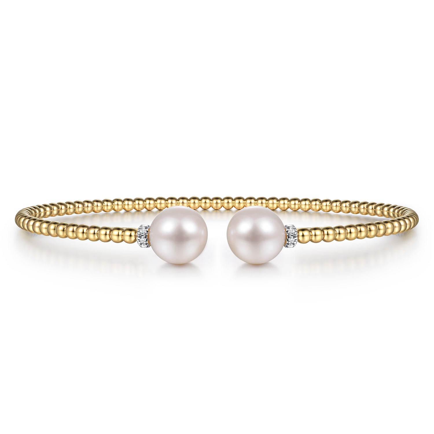 Lady's Yellow 14 Karat Bangle Bracelet Length 6.25 With = 0.05Twt Round Brilliant G/H Si1 Diamonds And 2 = 1.58Twt Fresh Water White Pearls
