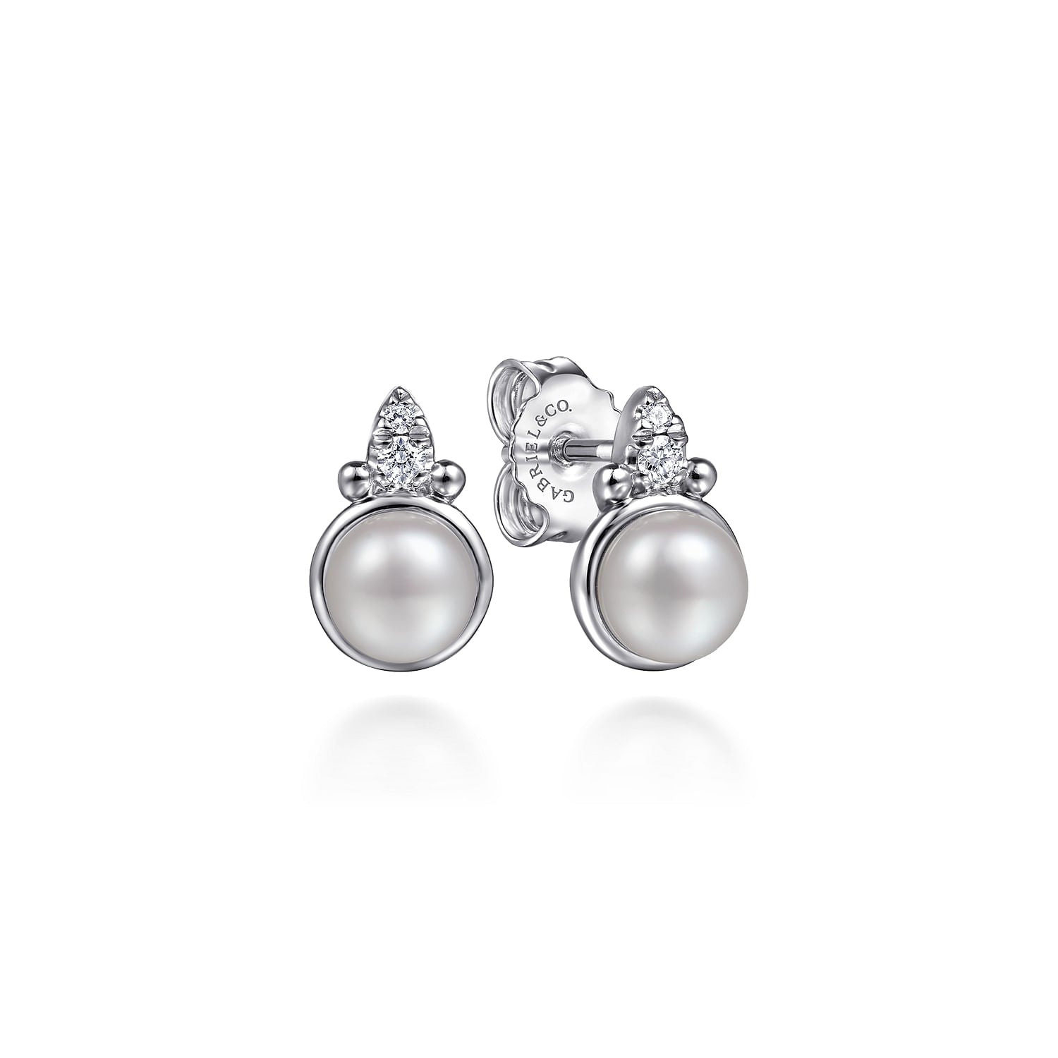 Lady's White Sterling Silver Stud Earrings With = 0.05Tw Round G/H Si1 Diamonds And = 0.33Tw Round White Pearls