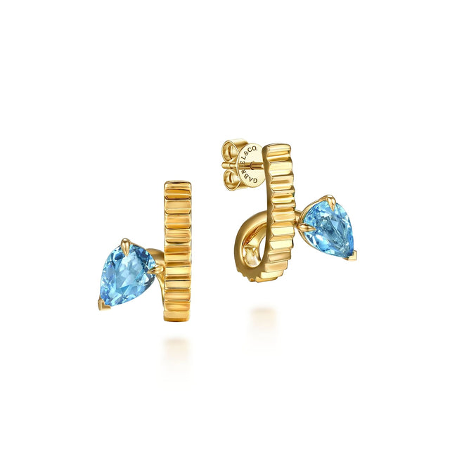 14K Yellow Gold Pear Shape Blue Topaz and Diamond Cut J-Hoop Earrings