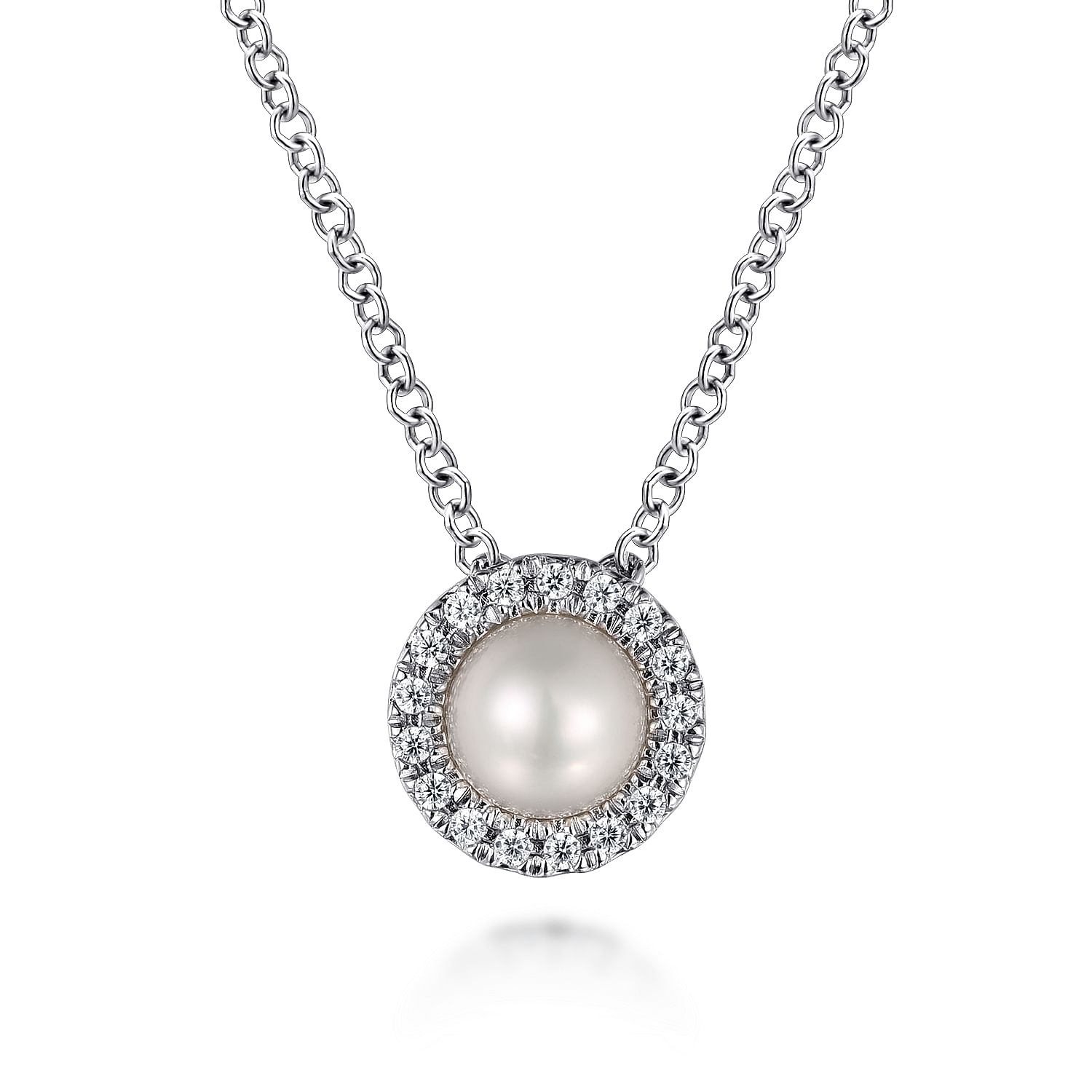 Lady's White 14 Karat Pendant Necklace Length 17.5 With = 0.06Tw Round Brilliant G/H Si1 Diamonds And = 0.20Tw Fresh Water White Pearls