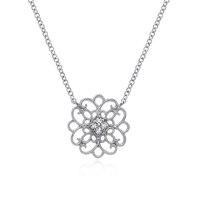 925 Sterling Silver Round Filigree White Sapphire Pendant Necklace