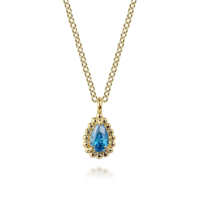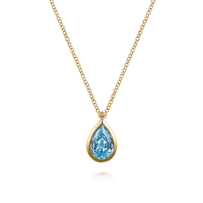 14K Yellow Gold Teardrop Blue Topaz Pendant Necklace
