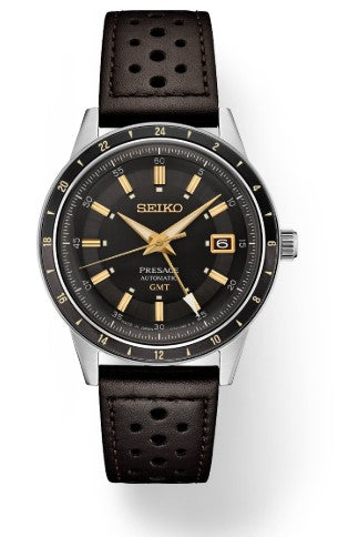 Presage Style60's GMT White Stainless steel Sport Watch with a Dark brown-gray dial with gold accents and a brown perforated leather strap