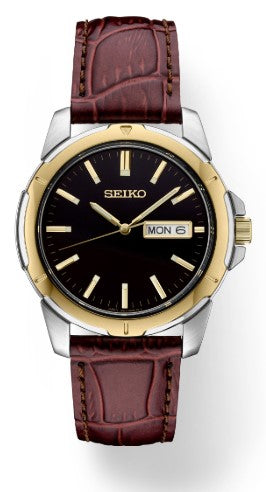 Essentials Collection White And Yellow Stainlesssteel Dress Watch with charcoal sunray dial with gold accents and a Brown Leather Strap