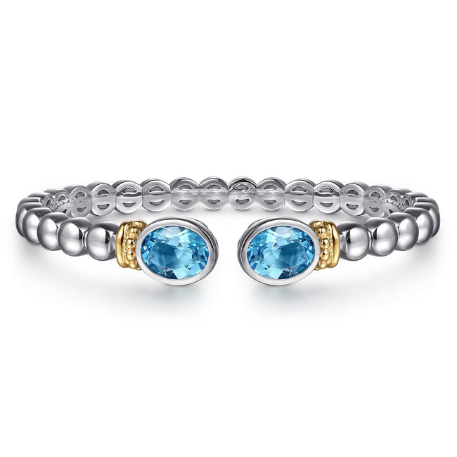14K Yellow Gold and 925 Sterling Silver Bujukan Blue Topaz Open Bangle Bracelet