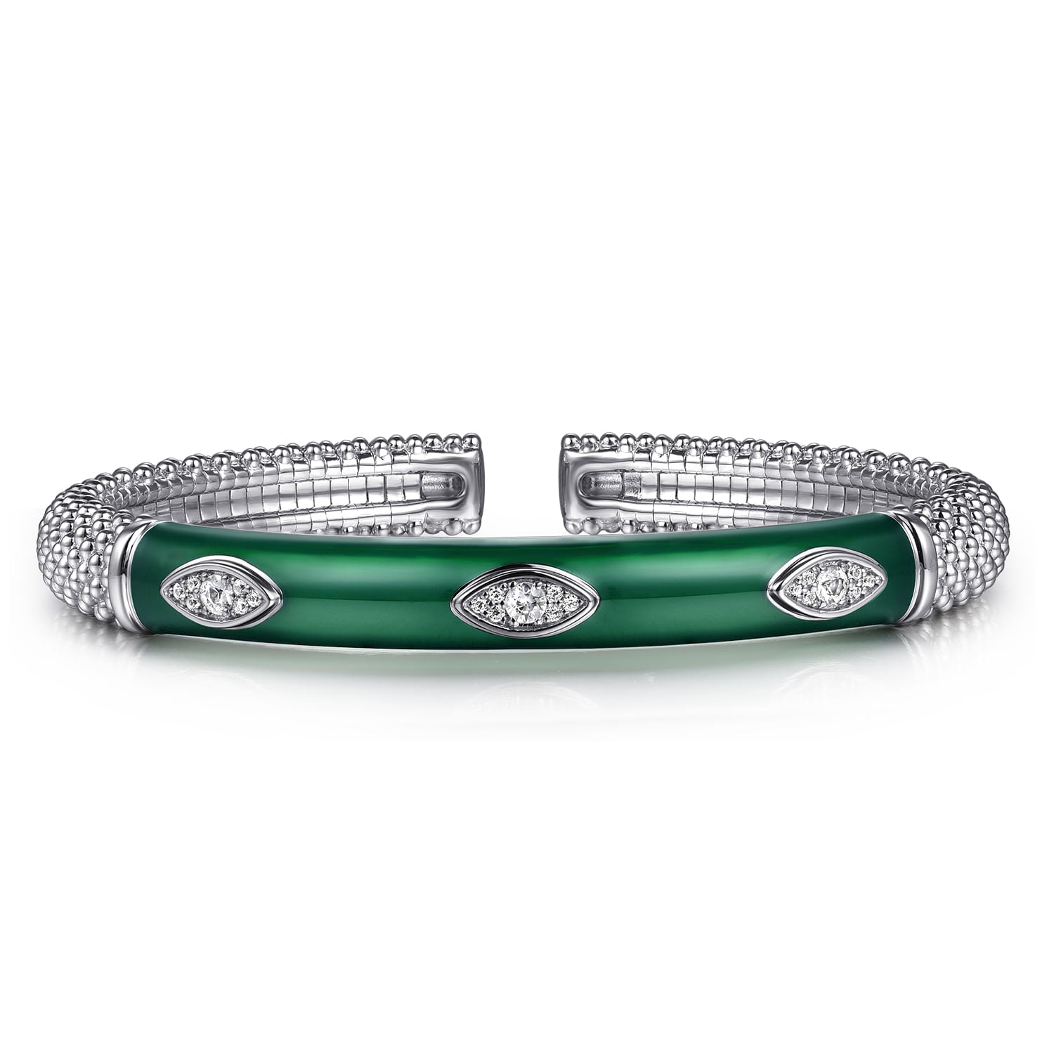 Lady's White Sterling Silver Bangle Bracelet Length 6 With = 0.30Twt Round White Sapphires Green Enamel