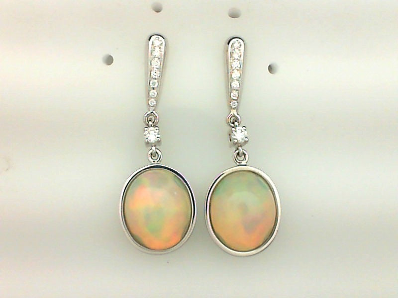 Lady's White 14 Karat Drop Earrings With = 0.17Tw Round Brilliant G/H Si1 Diamonds And = 4.29Tw Oval Opals