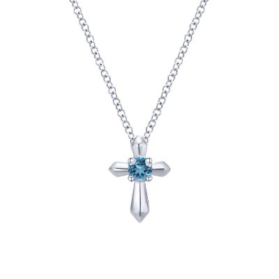 White Sterling Silver Cross Pendants Length 16 With 0.13Tw Round Blue Blue Topazs