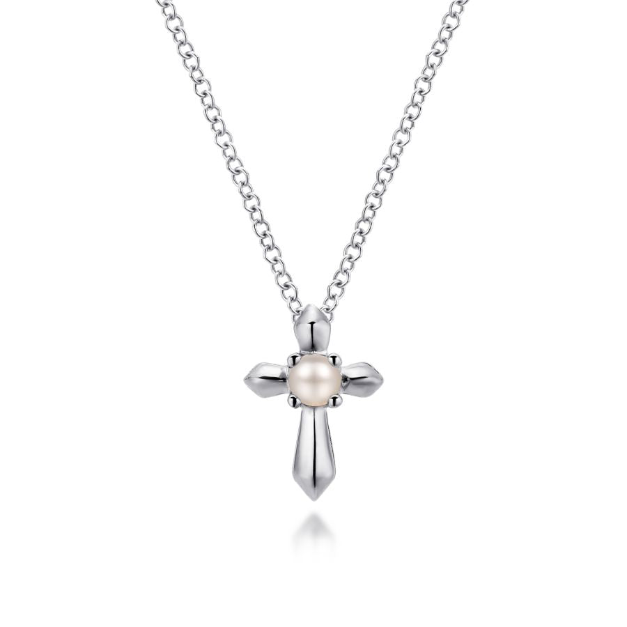White Sterling Silver Cross Pendant Length 16 With 0.06Tw Fresh Water White Pearls