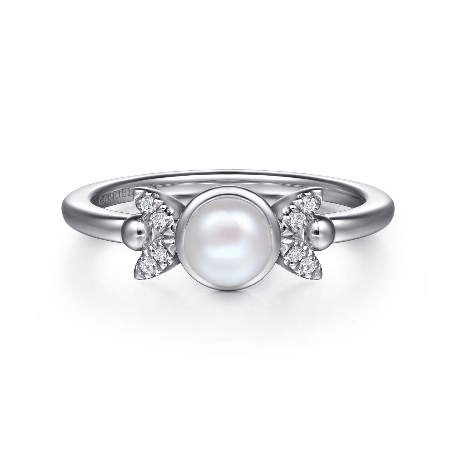 Lady's White Sterling Silver Cluster Ring Size 6.5 With = 0.05Tw Round Brilliant G/H Si1 Diamonds And = 0.20Tw Cultured White Pearls